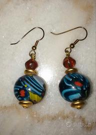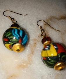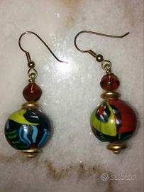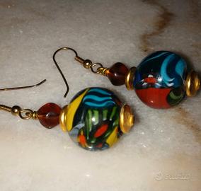 Vendo orecchini di bigiotteria nuovi, mai indossati, con palline colorate a tinte vivaci e palline più piccole color ambra, il colore del gancio si è un po' ossidato col tempo ed ha perso il dorato trattandosi di bigiotteria ma questo non inficia comunque la bellezza degli orecchini. Lungh tot dal gancio cm 5. Prezzo eu 10. Per vederli scrivere all'indirizzo mail indicato.