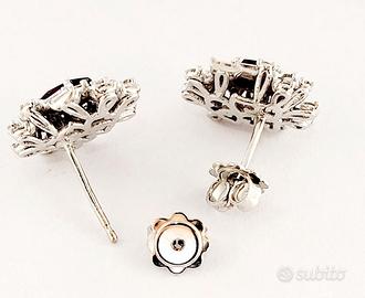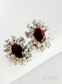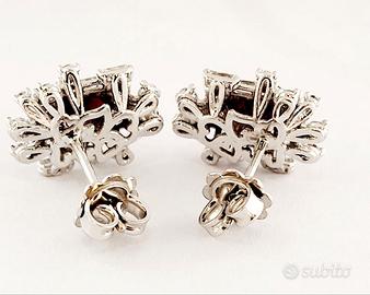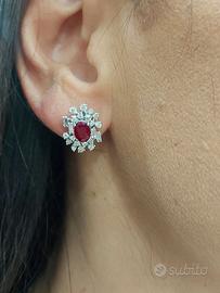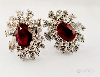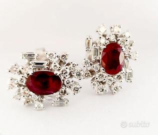 Orecchini a bottone vistosi esclusivi pendenti lavorati in Oro bianco 18kt 750/1000 incassati con Rubini ct 2,00 e Diamanti naturali ct 1,40con taglio brillante e taglio baguette con certificato