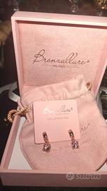 Orecchini pendenti Bronzallure realizzati in lega Golden Rosé, placcata Oro rosa 18kt, impreziositi da contro-maglia étoile con punti luce in cubic zirconia e da due pendenti con prisma gem dal taglio a cuscino (6x6 mm). Lunghezza 1.8 cm. Chiusura a perno e farfalla.