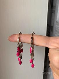 Orecchini a cerchio di color argento con pendenti di colore fucsia e pietre di vetro rosa.