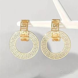 Orecchini a cerchio con traforata greca, in acciaio inossidabile, colore oro. Tutti i particolari traforati sono realizzati con intarsio in stile greco
