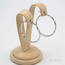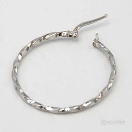 Orecchini a cerchio in oro bianco 18 kt grammi 2,2 a torciò. Il diametro è di cm. 3. Prodotto made in Italy munito di marchio di fabbrica come da legge e completo di confezione e certificato di qualità rilasciato dalla Gioielleria.
