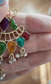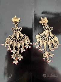 Orecchini chandelier in metallo dorato con perle e pietre colorate, condizioni perfette ad eccezione di una decorazione mancante, come evidenziato in foto.