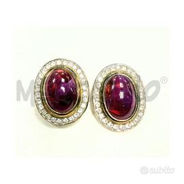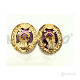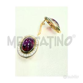 SPLENDIDI ORECCHINI VINTAGE A CLIP FIRMATI LE MOND DE BIJOUX . PRESENTANO CABOCHON OVALI VIOLA ROSSI CIRCONDATI DA STRASS BRILLANTI MONTATI SU METALLO DORATO. IL DESIGN ELEGANTE ESPRIME MAESTRIA ARTIGIANALE E FASCINO SENZA TEMPO.
