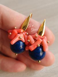 Orecchini realizzati a mano con chips di pietre di corallo rosa e pietre blu di lapislazzuli da 12 mm. Ganci a monachella in acciaio dorato.