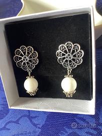 Stupendo fiore color argento anticato, pietra di Giada bianca da 12 mm. Lavorazione artigianato italiano. Nuovi con scatola regalo