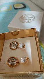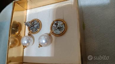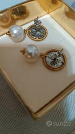 Ogni orecchino presenta una perla bianca luminosa e una moneta effetto antico incastonata in una cornice dorata lavorata, per un look sofisticato e ricercato.
