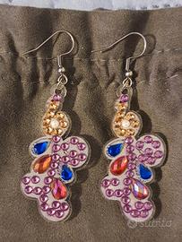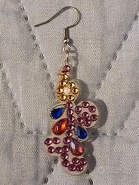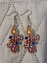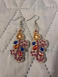 Nello specifico questi sono orecchini multicolore con perline strass rosa e gialle, mini gocce rosse e blu luminose e colorate che arricchiscono l'orecchino, tutti gli elementi contribuiscono ad esaltare ed impreziosire il bijoux.