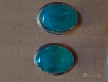 Orecchini con forma ovale in bigiotteria e decorati da pietra verde, chiusura a clip (indossabili anche da chi non ha i buchi alle orecchie).