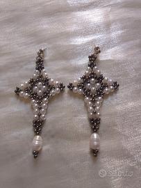 Orecchini Di Perle Croce Gotica Con Perle Di fiume Pendenti.