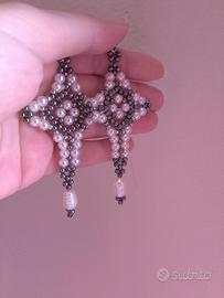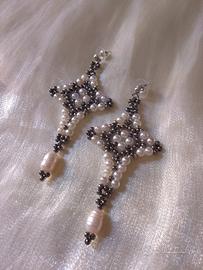 Intessuti a mano con rocailles di ottone e perle cerate con perle di vetro cerate colore avorio. Impreziositi da perle di fiume naturali pendenti.