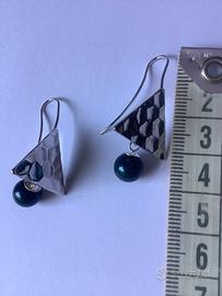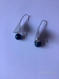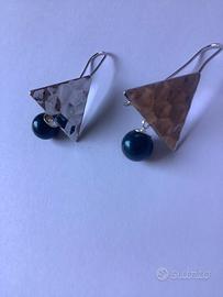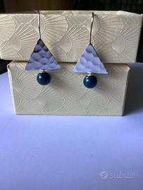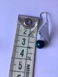 Eleganti orecchini dal design moderno. Forma triangolare color argento lavorato. Perla Swarovski color cobalto. Misura in foto. Dustbag in tulle