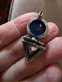 orecchini vintage in metallo con semisfera blu cobalto con incorporate scaglie metalliche. completa l'orecchino un triangolo pendente in cristallo sfaccettato.