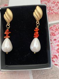 Orecchini a pendolo con corallo rosso sardo del mediterraneo naturale e madreperla naturale e onice, sono lunghi da 5 centimetri quelli senza onice e 6 centimetri quelli con l’onice. Nuovi realizzati a mano, con montatura di ottone che non si scurisce.