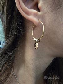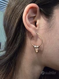 Bellissimi orecchini firmati DoDo by Pomellato in oro rosa 9 carati e granelli argento 925, modello a cerchio con cuoricino al centro pendente dal cerchio.