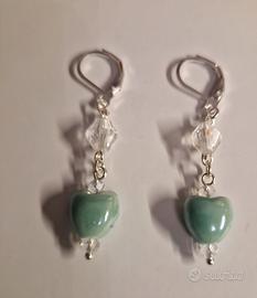 Orecchini artigianali con cuore di ceramica smaltata, cristalli e diamante (imitazione).