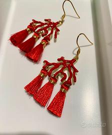 Orecchini nuovi creati artigianalmente con coralli in metallo zama smaltati e nappine super-luminose.