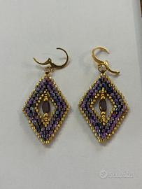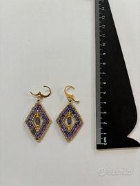 Orecchini pendenti da donna a forma di rombo, rosa effetto prisma e dorati con goccia centrale abbinata