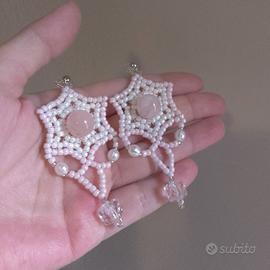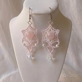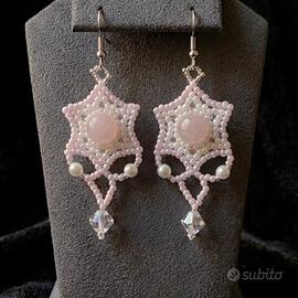 Earrings Unique Design Handmade in Italy Questo gioiello è fatto a mano in Italia utilizzando la raffinata tecnica bead weaving. Ogni pezzo è intessuto con cura, dando vita a un design unico e duraturo. L'uso di materiali di alta qualità assicura una brillantezza e una resistenza eccezionali. Orecchini Quarzo Rosa naturale. Artigianali. Eleganti. Intessuti con beads di vetro di colore rosa e avorio chiari. Frame a forma di stella con pietra di cristallo pendente e perle cerate avorio. Creazione versatile, adatta per svariate occasioni. Made in Italy Modello esclusivo in edizione unica. Qualità Top 100% artigianale a prezzi estremamente accessibili. Non faccio uso di colla, nichel o altri materiali tossici. Le pietre e il cristallo che compongono le mie creazioni sono certificati. Sono a disposizione per qualsiasi informazione aggiuntiva.