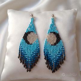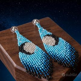 Questi orecchini artigianali sono un capolavoro di tessitura manuale, realizzati con la raffinata tecnica del bead weaving per fondere eleganza e spirito boho chic. Le minuscole perline Miyuki creano un motivo magnetico dove il blu profondo incontra il nero intenso, incorniciando una luna stilizzata che evoca cieli notturni e mistero. Le lunghe frange flessuose donano un movimento fluido e super glamour ad ogni passo, trasformando l'accessorio in un gioiello vibrante. Perfetti per chi ama distinguersi con uno stile etnico-contemporaneo, questi orecchini sono l'emblema di una sapienza artigianale che non passa mai inosservata.