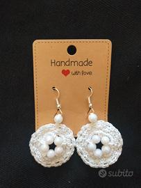 orecchini fatti a mano in puro cotone con monachella anallergica. Inamidati per mantenere la forma. Forniti con gommini per il fermo della monachella.