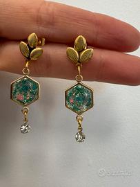 Orecchini realizzati a mano in acciaio inox con resina e fiori veri essiccati su base dorata con diamante pendente e perno a forma di foglioline!