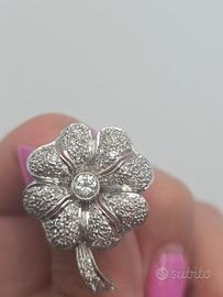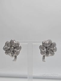 Meravigliosi orecchini a lobo con farfallina a forma di fiori in oro bianco massiccio 18 carati con diamanti naturali, uno centrale in ciascun fiore di 0,25 carati e tanti diamantini di varie dimensioni a tempestare il fiore.