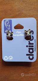 Un paio di orecchini Gatto, marca Clair’s, con clip. Presentano la testa di un gatto bianco e nero.