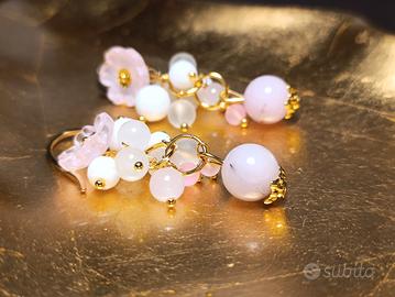 Pietra naturale quarzo rosa,diadpro fiori di ciliegi ,vetro frozen ceco , onice bianco ,Il fiore è realizzato a mano in vetro .La base degli orecchini è realizzata in acciaio inossidabile rivestito con una resistente lega ipoallergenica color oro.