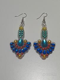 Nello specifico questi sono orecchini stile gitano multicolore, con perle gialle, perline strass azzurre, rosse e dorate e una goccia azzurra centrale che arricchisce l'orecchino...tutti gli elementi contribuiscono ad esaltare ed impreziosire il bijoux.