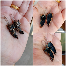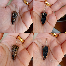 Orecchini artigianali in bronzo a forma di gufo con occhi cristallo.