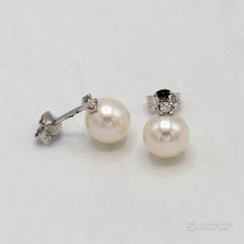 Orecchini HOSHI in oro bianco 18 kt grammi 2,3 con perle coltivate in ostrica d’ acqua dolce di colore bianco e di mm. 7,5/8 e diamanti taglio brillante di ct 0,06 colore F VS. Prodotto completo di confezione e certificato di qualità rilasciato dalla Gioielleria.
