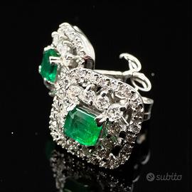 Montano smeraldi naturali non trattati (0,50 ct totali) circondati da 0,63 ct di diamanti naturali taglio brillante colore G e purezza vs, disposti in doppia fila per un effetto molto luminoso.