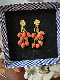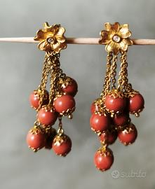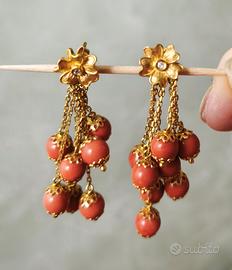 Elegante coppia di orecchini pendenti a grappolo, un classico dell'oreficeria artigianale italiana della fine del XX secolo. Questo gioiello si distingue per il raffinato equilibrio tra il calore del corallo e la lucentezza dell'oro, impreziosito da un dettaglio di luce discreto ma prezioso. Perno a Lobo: Caratterizzato da un delicato motivo a fiore in oro giallo satinato al cui centro è incastonato un piccolo brillante (punto luce). Pendente a Grappolo: Una dinamica composizione di catenelle in oro che sorreggono sfere di corallo rosso mediterraneo (8 per orecchino), ciascuna rifinita da una calottina dorata lavorata a traforo. Materiali: Realizzati in oro 750, tipico della manifattura italiana dell'epoca e corallo naturale autentico. Stile: Un design intramontabile che evoca lo stile neo-vittoriano in voga negli anni '90, perfetto per occasioni formali o per un look vintage ricercato.