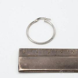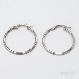 Orecchini in oro bianco 18 kt grammi 1,3 a cerchio . La lavorazione è tubulare lucida e il diametro è di cm. 2,4. Prodotto made in Italy munito di marchio di fabbrica come da legge e completo di confezione e certificato di qualità rilasciato dalla Gioielleria.