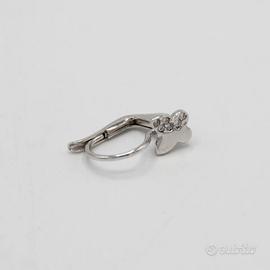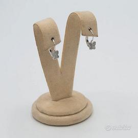 Orecchini bimba in oro bianco 18 kt grammi 1,8 con farfalle. La chiusura è a monachina e la lavorazione è lucida con zirconi di colore bianco. Prodotto made in Italy munito di marchio di fabbrica come da legge e completo di confezione e certificato di qualità rilasciato dalla Gioielleria.