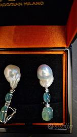 Vendo coppia di orecchini in oro bianco 750% con perle barocche (vere), diamanti taglio brillante, acque marine milk taglio cabochon.