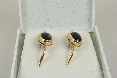 OR493 Eleganti e raffinati orecchini in oro giallo 18 K. a forma ovale con al centro grossa pietra di granato cabochon. Corpo a cestello sottostante a giorno. Chiusura con gancetto a scatto. Marchiati sul gancetto "750 - 9823 AL" ottimo stato di conservazione e lucentezza. Italia - Valenza Seconda metà '900 H. max. aperti 2,8cm. H. max, chiusi, 1,8 cm. L. max. 1,2 cm. Prof. max. 1,3 cm. Peso, 5,2 gr. Spedizione assicurata e/o raccomandata tracciabile con costo da concordare. Per cortesia contattatemi solo se realmente intenzionati. Non chiedetemi se disponibile. Gli annunci venduti, vengono rimossi immediatamente. Questo é un negozio on-line a prezzi fissi. Sono a disposizione al