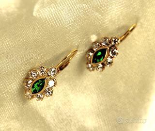 Particolari orecchini a monachella " cosidetti della nonna" in oro giallo 18 K a forma di mandorla, con al centro 2 smeraldi e corone di 8 joliti.