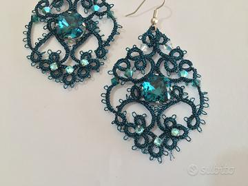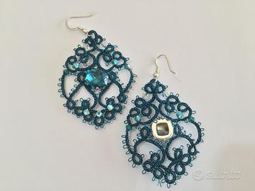 Questi raffinati orecchini artigianali sono realizzati a mano con la tecnica del pizzo chiacchierino ad ago. Il design ricco e armonioso evoca motivi barocchi, impreziosito da un'elegante pietra centrale Swarovski color acquamarina, circondata da piccoli cristalli iridescenti. La lavorazione in filato metallizzato blu petrolio dona un tocco di brillantezza sofisticata, perfetta per cerimonie, serate eleganti o per aggiungere un accento di classe a qualsiasi outfit. Leggeri e unici, sono un esempio di artigianato italiano di alta qualità.