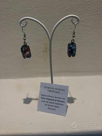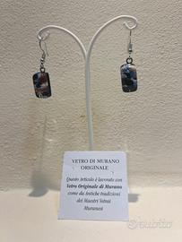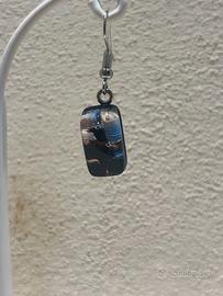 Orecchini semplici in vetro di Murano a blocchetto con decorazioni interne perlate effetto liquido a macchie blu, argento, nero e rosa. Nuovi, mai indossati, da negozio in chiusura. Unici e artistici.