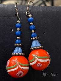 Eleganti orecchini pendenti realizzati in vetro di Murano. - Perle sfaccettate blu. - Elementi decorativi a forma di cono azzurro. - Sfere arancioni con decorazioni a spirale bianche, verdi Delicati orecchini realizzati in vetro di Murano, con un design a goccia impreziosito da dettagli dorati. - Vetro di Murano lavorato a mano. - Motivi decorativi dorati. - Chiusura a monachella.
