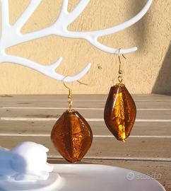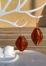 Eleganti orecchini in vetro di Murano. Presentano una forma a rombi con inclusioni dorate che catturano la luce.