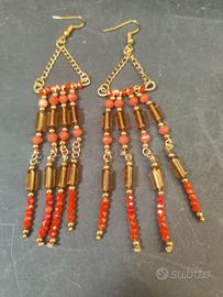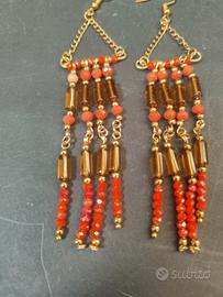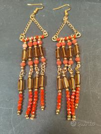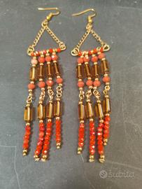 orecchini lunghi leggeri agata arancione, cristalli rossi, catenella acciaio dorata fatti mano