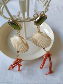 orecchini lunghi da donna realizzati con conchiglia in resinato,3×2,5 cm corallo, perno verde.