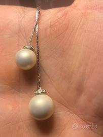 Bellissimi orecchini lunghi con doppia perla bianca e dettagli brillanti.