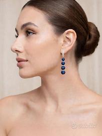 Preziosi orecchini in ottone laminato oro, anallergici, e zaffiri naturali, a scalare, rinforzati nel colore. Con piccoli swarovsky a illuminare il tutto. Eseguiti a mano. Lunghezza: 6 cm c.a. Gli orecchini sono nuovi, mai indossati. L'attacco è a cerchietto.
