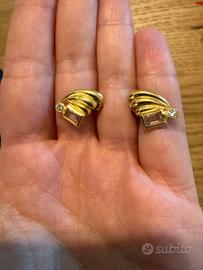 Elegante coppia di orecchini a lobo in oro giallo 18 carati (750), caratterizzati da un design a ventaglio tipico dell'alta gioielleria vicentina degli anni '80/'90. Prodotti nel cuore del distretto orafo di Vicenza, presentano il punzone di fabbrica "1315 VI" e il marchio MDC. Lavorazione scanalata a raggiera con incastonate pietre dal taglio geometrico (stile baguette/emerald) di un delicato color rosa/ametista chiaro, sormontate da un punto luce brillante.