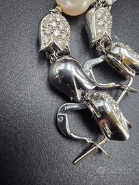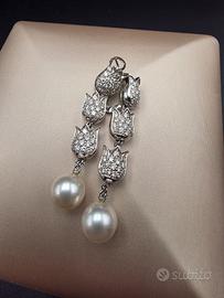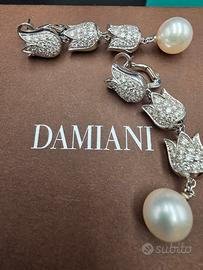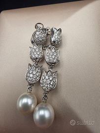 Bellissimi orecchini Mikawa di Damiani in oro bianco massiccio 18 carati con fiori adornati di pavé di 96 diamanti naturali taglio brillante di 1 carato complessivo e una perla naturale giapponese finale per ciascun orecchino da 9 millimetri di diametro.