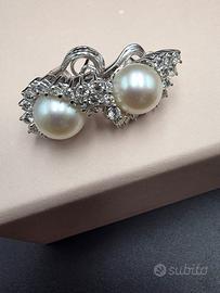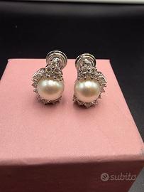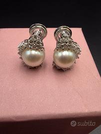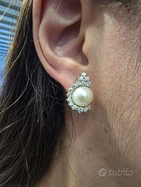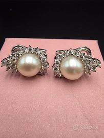 Stupendi orecchini prestigiosi di Mikawa Damiani in oro bianco 18 carati con 2 perle Akoya del Giappone di diametro 9 millimetri e 30 diamanti naturali taglio brillante di 1 caratura totale.